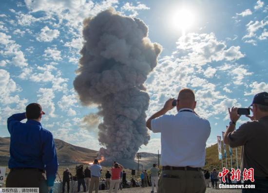 中新网6月29日电 据外媒报道,当地时间2016年6月28日,Orbital ATK公司在位于犹他州的工厂附近,再次成功对其全新的五段式固体火箭推进器(SRB)进行地面静态点火测试。
